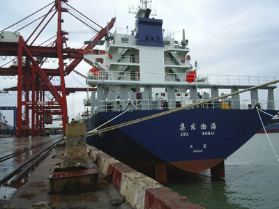 5月12日,在连云港集装箱码头,一艘名为“集发渤海”号集装箱船在连云港集装箱码头装载着国际集装箱徐徐的离开连云港集装箱码头,驶向日本神户、大阪,该班轮实行周班服务,标志着大连安通船务代理有限公司正式加盟增开连云港至日本集装箱班轮航线。