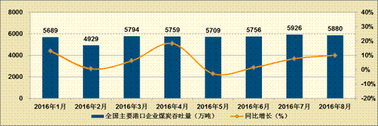 从价格看,中国煤炭价格指数继续上涨,8月底中国煤炭价格指数126点,比年初上涨6.5点,同比上涨1.2点。进口方面,8月份,我国进口煤炭暴增,同比增长52%;1-8月份累计进口煤炭同比增长12.4%。在进口煤炭大幅增长的拉动下,我国主要港口企业煤炭吞吐量增速继续回升,8月份,完成煤炭吞吐量5880万吨,环比下降0.8%,同比增长10.1%,如图3所示;1-8月份,主要港口企业完成煤炭吞吐量45443万吨,同比增长6.6%。