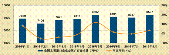 8月份,国家稳增长和去产能政策效果显现,钢铁产量难以大幅增长,同时进口铁矿石库存仍保持较高的水平,国内铁矿石市场供求矛盾仍未改观。8月份,我国进口铁矿8772万吨,同比增长18.3%。8月末全国进口铁矿石港口库存量为10540万吨,同比增长30.8%,全国进口铁矿石港口库存量已经连续5个月超过亿吨。