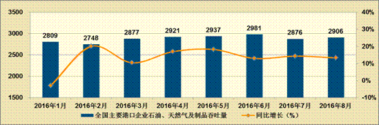 进口方面,受国际原油价格持续低迷和民营炼油企业逐步获得进口原油配额的影响,原油进口量基本保持较快的增长速度。8月份,中国原油进口量同比增长23.5%;1-8月份累计同比增长12.1%。