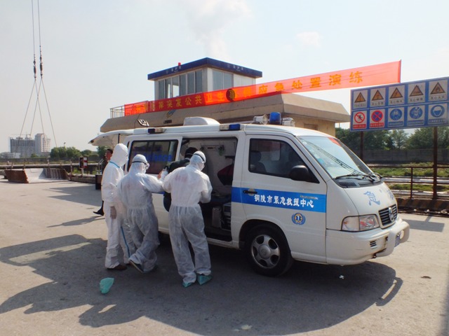 2013年8月16日上午9时整,在铜陵港长江外贸码头举行了铜陵口岸突发公共卫生事件应急演练。铜陵出入境检验检疫局、铜陵口岸办、铜陵商务局、铜陵市卫生局、铜陵市急救中心、铜陵市疾病控制中心、铜陵边防检查站等单位参加了这次应急演练。