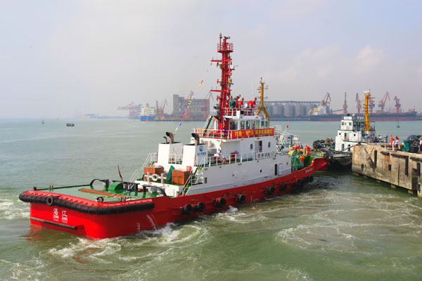 据介绍,拖轮是为货轮靠、离泊码头,引助航提供动力辅助和安全保证的工作船舶,是港口生产必不可少的作业船舶。此次加盟湛江港的6000HP全回转消拖两用拖轮,主机额定功率为2206KW×2(6000马力),总长43米,型宽11米,型深5米,航速14.9节,续航能力不少于1000海里,主要设备采用目前世界最先进的进口产品。该轮具有强大的水上消防能力,消防平台上配备2台进口的Fi-Fi 1级消防水炮,喷射射程超过150米,高度超过70米,另有2台射程大于80米的辅消防水炮(水/泡沫两用消防炮),1套射程大于30米的干粉炮。