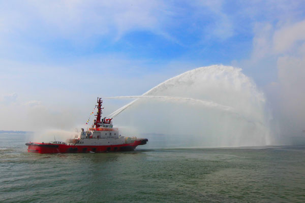据悉,该轮由上海港复兴船务公司建造,全焊接钢质,双柴油机双360度全回转导管可调螺距螺旋桨推进,是目前全国港口最大、装备最先进、功能最齐全的消拖两用拖轮,平时可以满足正常港口生产业务,一旦出现火情,能够立刻发挥海上消防的功能。它的加盟将解决湛江港大吨位船舶的靠离作业和近海拖带问题,而随着湛江港石化仓储区日前已成为广东省最大的石化仓储区,该轮还将为湛江港乃至粤西地区的水上消防安全提供坚实保障。