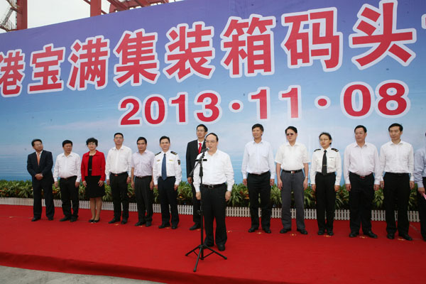 2013年11月8日上午,湛江港集团举行湛江港宝满集装箱码头试运行仪式,湛江市市委书记、市人大常委会主任刘小华宣布码头正式试运行。这标志着湛江港集团又一座大型化、专业化、现代化新港区——宝满港区的诞生,将有力提升湛江港集装箱业务发展的核心竞争力,有效促进湛江港口整体综合物流服务水平的跨越升级,不断推动湛江临港产业经济和临港物流链的繁荣发展,强劲助力湛江经济乃至区域经济的新一轮腾飞。