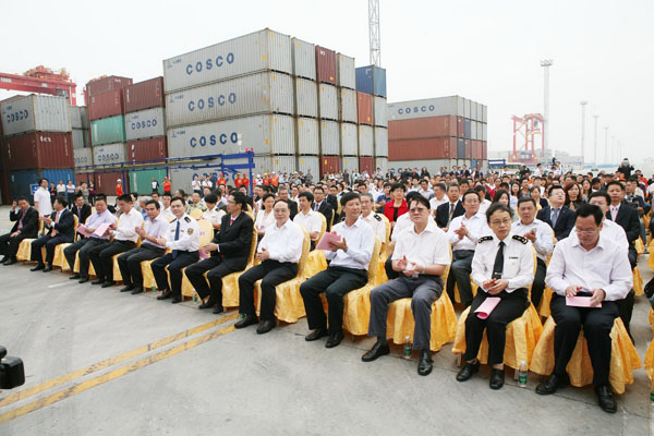 是日,首航湛江港宝满集装箱码头的“高河”轮,由中远集装箱运输有限公司所属并运营,载重吨47630吨,运力2761标准箱,是迄今挂靠湛江港最大的集装箱班轮。该轮执行“湛江-营口”南北直航干线,具体航线为“湛江-钦州-蛇口-营口-天津-大连-蛇口-湛江”,每4~5天一个航次。本航次“高河”轮从蛇口港驶至湛江港,在湛江港装卸集装箱共1461TEU,其中卸载产自东北的玉米和豆粕等货物共735标准箱用于满足湛江及周边地区饲料生产和养殖业需要,装载本地及西南腹地客户的冻虾、化肥、高岭土、木板及纸制品等货物共726标准箱驶向钦州港。