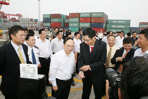 市委书记刘小华在聆听湛江港集团领导介绍宝满集装箱码头的有关情况