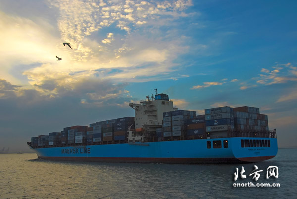 一艘集装箱船行驶在天津港主航道上。胡志强摄