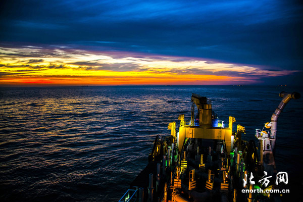 晚霞中的挖泥船在天津港主航道施工。许让利摄