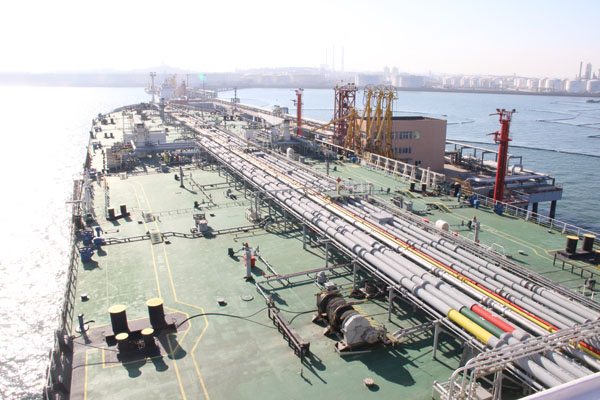 图为大型油轮“海洋皇冠”在液体化工码头进行安全有序的装船作业。
