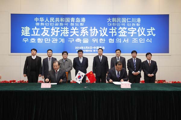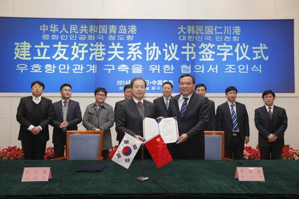青岛港与仁川港有着长期良好的合作。2013年6月,郑明辉、成新农会见了来访的金春善一行。双方进行了深入交流,确定在集装箱、邮轮、汽车、低碳港口、港口运营管理5个重点领域加强合作,并就建立友好港关系达成共识。2013年11月,郑明辉一行访问仁川港湾公社,实地考察仁川港内港和正在开发建设中的新港。2013年两港之间集装箱班轮贸易量同比增长18%,通过客班轮航线进出境旅客12万人次。