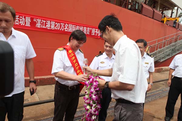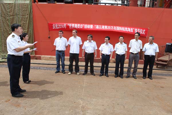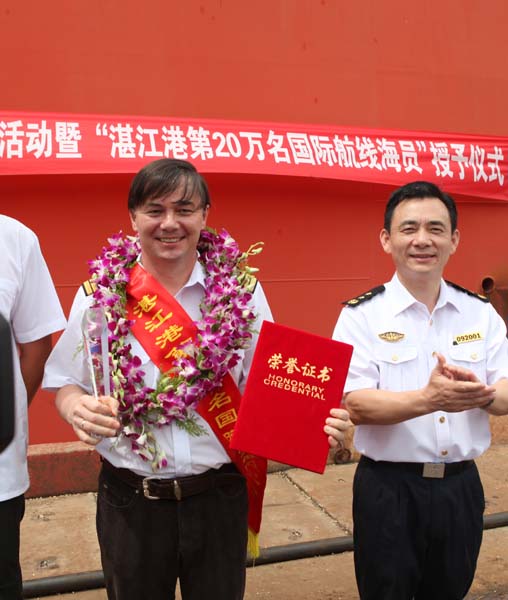 当日下午,湛江海事局王建华局长为湛江港开港以来第20万名国际海员——“捷豹”轮船长戈尔斯基·亚努什(GORSKI JANUSZ)颁发了纪念证书、绶带,张翼董事长为船长送上纪念奖杯并佩戴花环。1956年5月1日,新中国自行设计的第一个海港湛江港开港,1956年12月27日,万吨巨轮——波兰籍“玛布切克”号首次驶进湛江港,开始了湛江港与世界的交流;此刻,湛江港走过了58年的历程,今年湛江市港口吞吐量将有望突破2亿吨,而湛江港第20万名国际海员戈尔斯基·亚努什恰好也是来自波兰。这一历史巧合,正好见证了湛江港日新月异的发展与壮大。