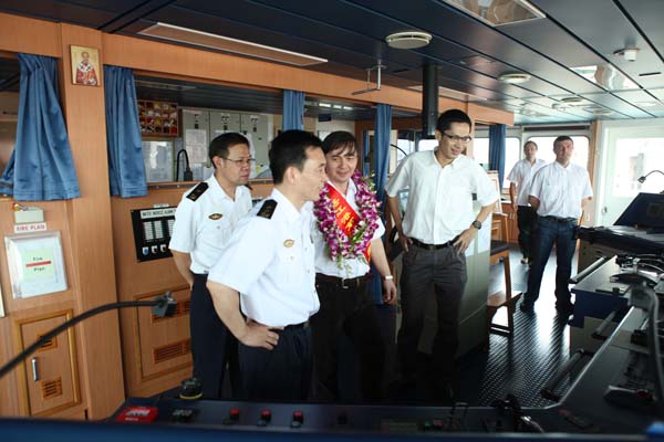 王建华局长在致辞中希望海员朋友们在往来世界各地的同时,把世界带到湛江,把湛江带向世界。戈尔斯基·亚努什船长对海事部门和湛江港集团提供的热情周到的服务表示感谢,并表示,全力配合做好装卸工作,为湛江的发展作出海员们的贡献。随后,船长热情地带领大家参观了“捷豹”轮驾驶台,并祝愿湛江港发展越来越好。