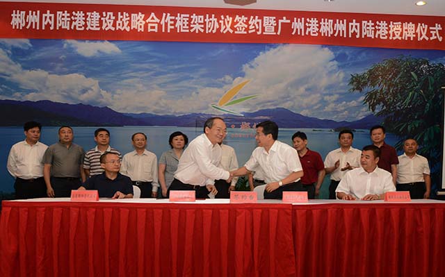 陈洪先代表广州港股份与郴州市人民政府、湖南兴义物流公司、浩通国际货运代理公司签署了郴州内陆港建设战略合作框架协议。根据协议,四方将围绕建设郴州内陆港及发展铁海联运业务开展合作,为郴州生产企业和物流企业打造一条便捷、稳定的通江达海的物流通道。根据协议,郴州市政府将支持铁海联运运输模式,协调海关、检验检疫等部门优化郴州口岸通关服务、简化通关手续、降低通关成本、提高通关效率;广州港股份将在郴州设立内陆港,打造郴州公共物流服务平台,对当地企业及进出口货物经广州港港口码头时,在码头操作上给予费率优惠、服务优待、现场作业优先等便利,确保郴州进出口企业及货物享受集疏优惠、优质、顺畅、高效的码头操作服务。作为湖南知名的物流、货运企业,兴义物流和浩通公司将共同让利培育铁海联运市场,兴义物流负责场站操作,提供场站作业所需的场地和机械,并给予合作业务优惠作业费率的支持;浩通公司负责铁路货源的组织,协调铁路部门关系,进出口企业货物报关报检、租船订舱等业务的咨询及办理,为进出口企业提供门到门物流服务。