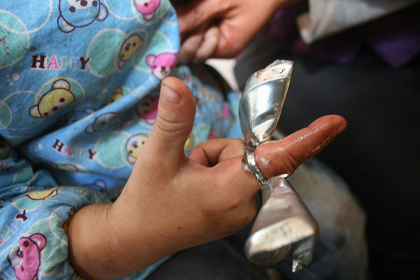 11月4日,青岛港公安局消防一中队在最短的时间内成功解救一名手指卡在铁环中的儿童。由于港口消防官兵高度的责任心和一流的业务素质让小男孩的手指得以及时取出,没有受到严重伤害,受到了小男孩父母的高度赞扬。(张伟)