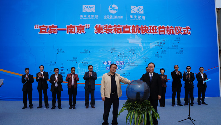 在随后举行的“宜宾—南京”集装箱直航快班首航仪式上,南京市委常委、常务副市长刘以安、宜宾市人大常委会主任陆振华共同启动“宜宾-南京”集装箱直航快班首航开航水晶球,标志着“宜宾—南京”两港间始发集装箱直航快班正式起航。仪式由宜宾市委常委王可主持。南京市政府副秘书长钱建宁,南京市交通运输局局长陈雷,南京市交通集团董事长、党委书记张映芳;宜宾市政府秘书长邓前卫,临港开发区党工委副书记、管委会主任童叔刚出席仪式;南京港集团法定代表人、总经理沈卫新,宜宾港公司董事长刘征宇,民生轮船公司航运管理部部长、民生国际货物运输有限公司副总经理刘万洪出席首航仪式并致辞;两地相关政府部门代表、成都铁路局、内支线船公司等特邀企业嘉宾以及新闻媒体参加了活动。