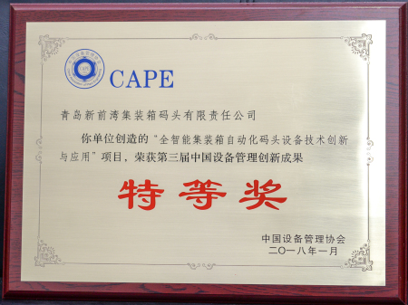 1月18日,由中国设备管理协会主办的“第三届中国设备管理创新成果交流大会”在北京召开,青岛港全自动化集装箱码头一举荣获四项大奖,其中,青岛新前湾集装箱码头有限责任公司(QQCTN)获评“第三届中国设备管理创新示范单位”;QQCTN总经理张连钢获评“中国设备管理创新领军人物”;“全智能集装箱自动化码头设备技术创新与应用”创新成果荣获特等奖,并排名第一;“全自动化码头岸边装卸系统的技术创新与应用”创新成果荣获一等奖。一家企业同时获得4项大奖是大会首次,在特等奖中排名第一位,是全国港航界首次。