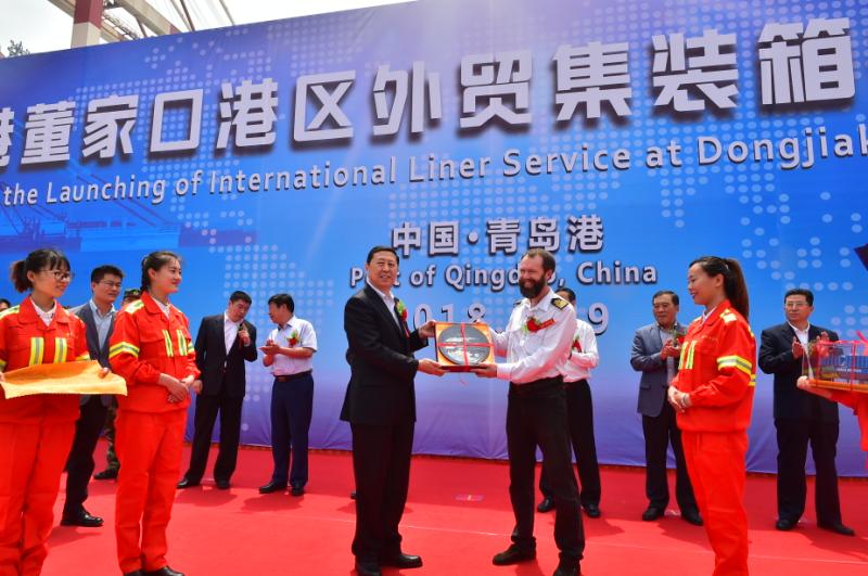 青岛港集团党委书记、董事长郑明辉出席航线开通仪式,与“东方海泛宁波”轮船长伊万诺夫互赠纪念品,并宣布装卸令。青港国际董家口分公司经理赵波、中远海运集运副总经理于涛、黄岛海关副关长高从军、青港国际总裁焦广军先后致辞。