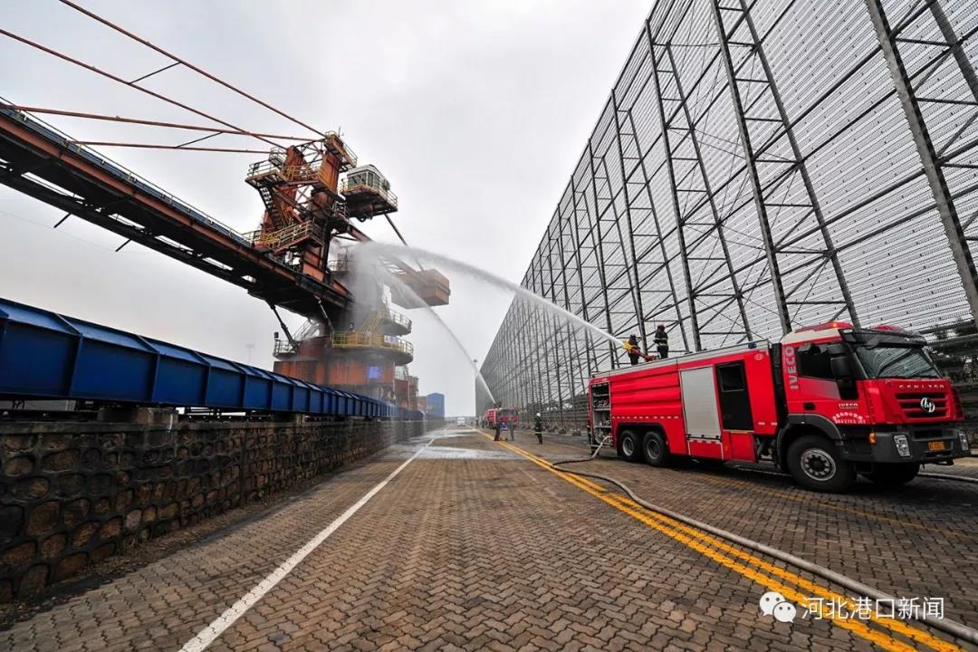演练模拟情景为九公司13号堆料机维修作业时突发火灾,演练科目包括事故报告、灭火、伤员救治、应急环境监测、现场交通管制等内容。演练过程中,现场工作人员发现火情后立即上报事故,九公司逐级启动火灾事故应急预案和应急处置方案,实施初期灭火;火势扩大后,秦港股份公司启动综合应急预案,在应急指挥部的协调下,公安局消防支队组织实施灭火,其他力量协同救援,成功扑灭火灾。