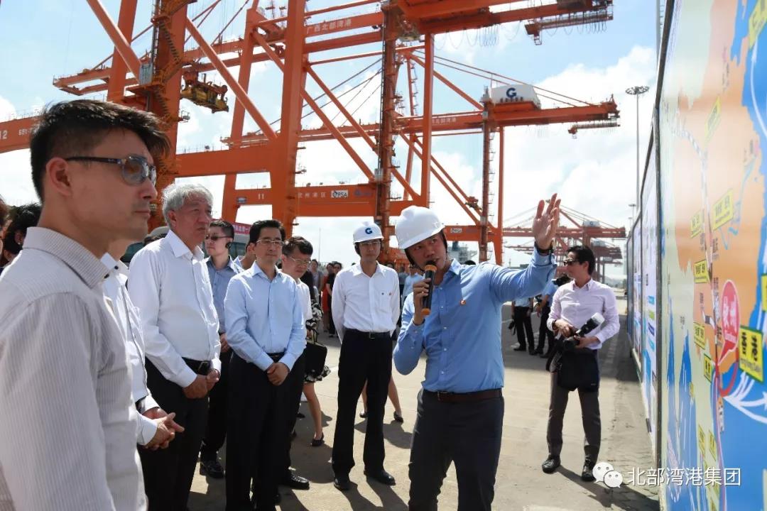 在4#泊位前沿,北港集团总经理戴翔向张志贤副总理介绍近年来北部湾港在服务区域经济社会发展中的有力举措,特别是在“一带一路”框架下,主动拓展与东盟国家合作、积极融入中新互联互通南向通道项目建设等方面取得的实质性进展;北港集团与新加坡PSA、PIL在港口、航运、物流等领域的合作进展顺利,有力促进北部湾港竞争力的持续提升。北部湾国际集装箱码头总经理黎志伟向张志贤副总理介绍了合资码头的运营情况,重点汇报了双方合力推动南向通道及智慧港口建设取得的进展。