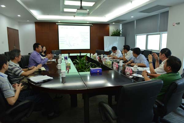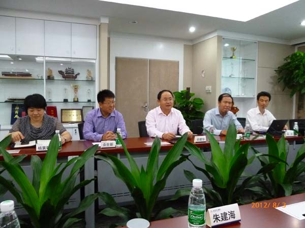 陈英明(中)、朱建海(右二)、杜麒栋(右一)、秦汾、丁莉(左一)与SCT总经理严刚(左二)座谈
