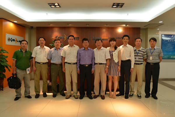 陈英明(前左)在向SCT总经理严刚(前右)了解该公司转型发展的情况