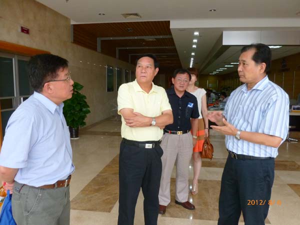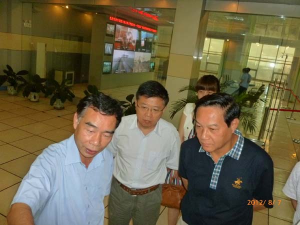 陈英明(右二)、朱建海(右一)等听取北海港股份有限公司董事长黄葆源(左二)等的介绍