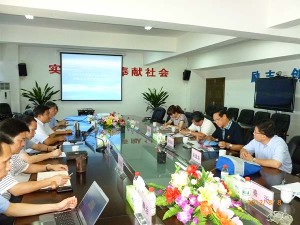 陈英明(右二)、朱建海(右一)等与北部湾集团叶时湘(左一)、赖明章(左二)等就调研情况交换意见