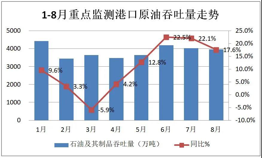 三、8月下旬重点监测港口原油吞吐量同比小幅回落