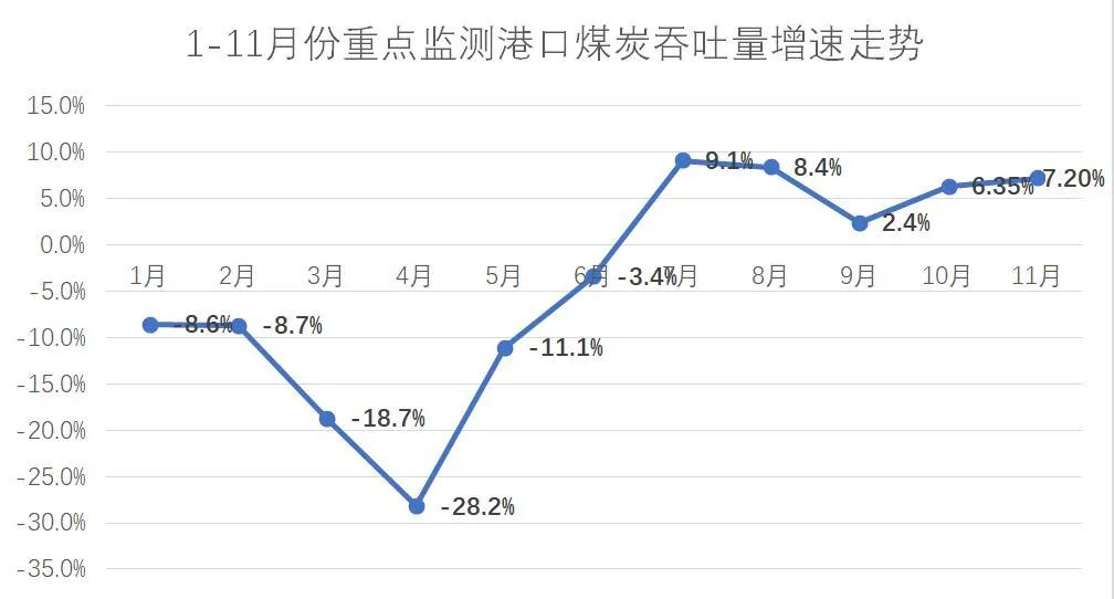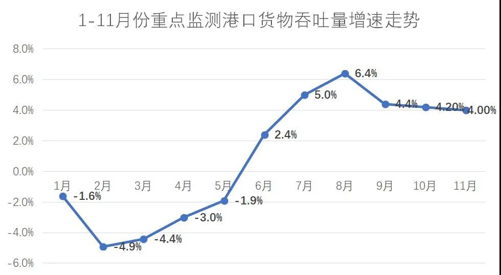 11月份,我会重点监测沿海港口货物吞吐量同比增长4%,1-11月份累计增长1.1%。