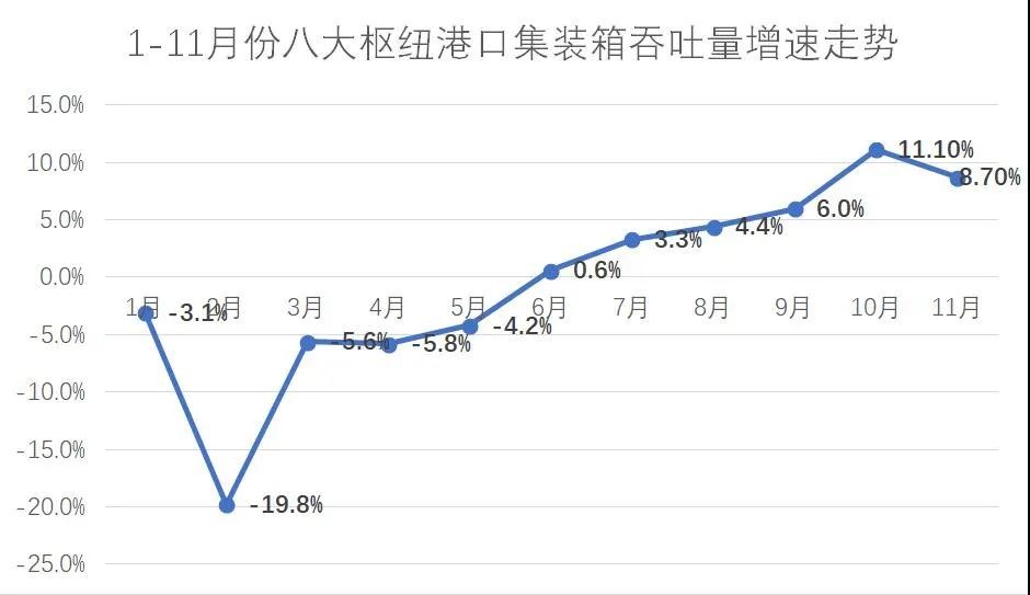 集装箱业务继续保持较好回升态势。11月份,八大枢纽港口集装箱吞吐量同比增长8.7%,增速较10月份回落2.4个百分点。其中,外贸增长8.4%,较10月份回落3.5个百分点,内贸同比增长9.4%,略快于10月份。分港口看,天津、青岛、上海、宁波舟山、深圳港口集装箱吞吐量增速均超过10%。1-11月份八大枢纽港口累计集装箱吞吐量恢复至去年同期水平。