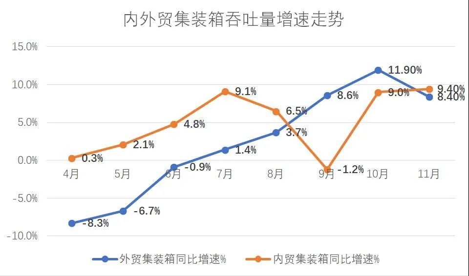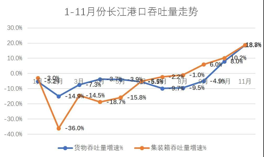 长江港口生产全面提速。11月份,长江枢纽港口货物吞吐量和集装箱吞吐量分别同比增长18.7%和18.8%,创全年最高增速。1-11月份货物吞吐量和集装箱吞吐量累计同比回落3.4%和4.9%,降幅收窄。