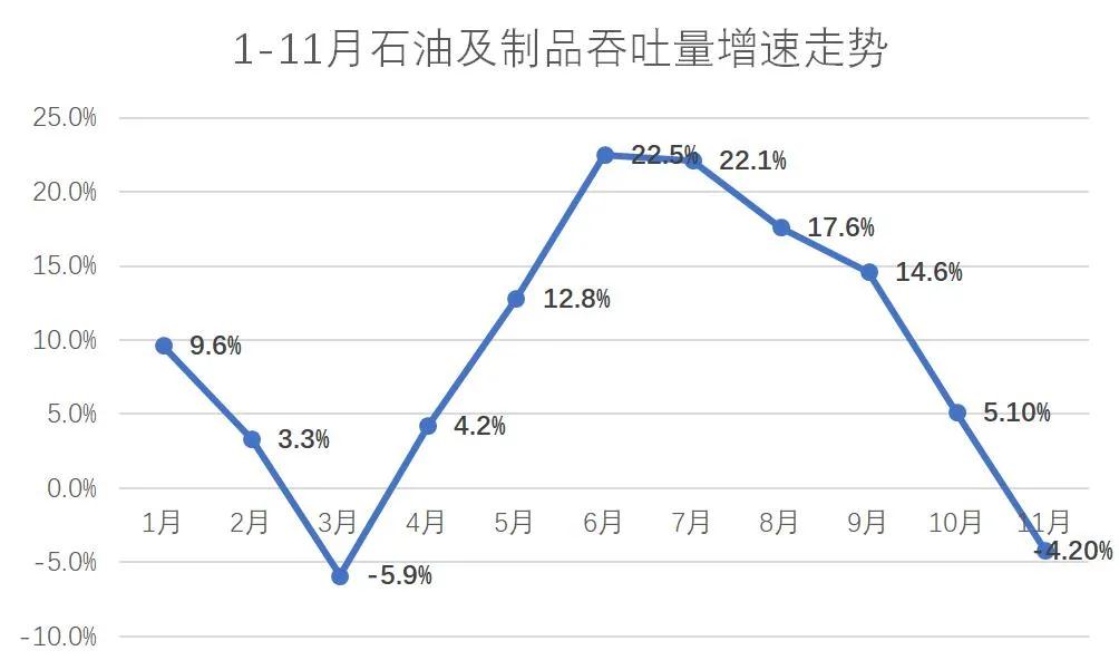 原油进口进一步放缓。重点监测港口11月份油品吞吐量同比回落4.2%,这是4月份以来首次同比下降。1-11月份累计同比增长8.9%。