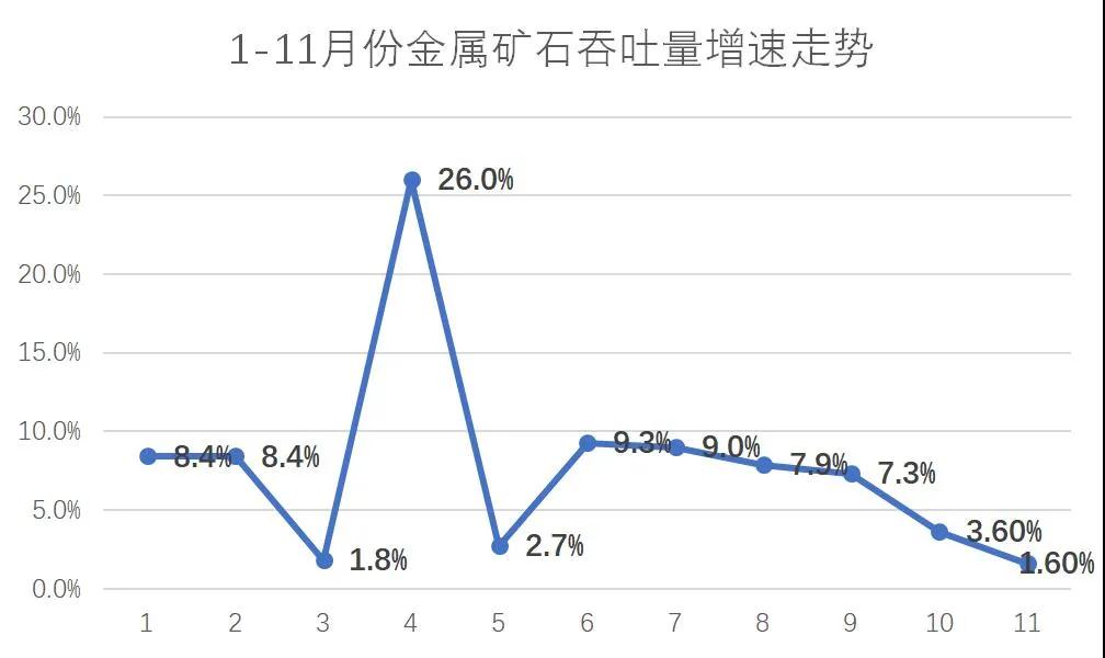 矿石吞吐量增速回落。重点监测港口11月份矿石吞吐量同比增长1.6%,较10月份降低2个百分点。1-11月份累计同比增长7.6%。