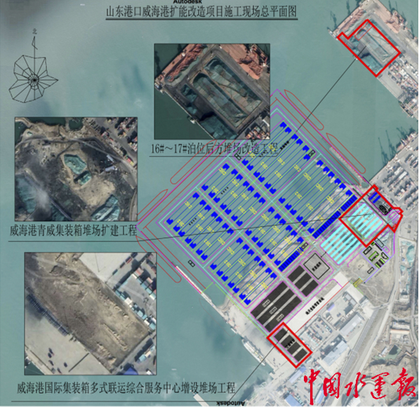 此次开工建设的威海港扩能改造项目,位于威海市环翠区威海港港内,总面积约12.64万平方米,包括5.4万平方米的青威集装箱堆场扩建工程,2.44万平方米的国际集装箱多式联运综合服务中心增设堆场工程,以及4.8万平方米的三四期码头16#、17#泊位后方改造工程。