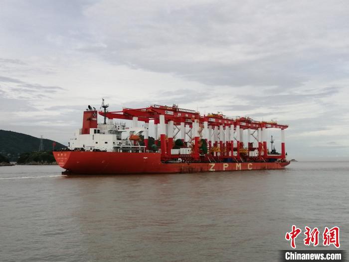 载运着10台轨道吊的“振华32”轮靠泊上海洋山港四期自动化码头。洋山港海事局供图