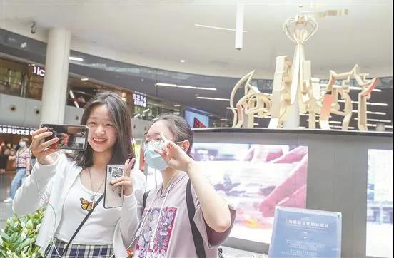上海市民在地铁人民广场站展示的“航运之心”前“打卡”。王雨青 摄