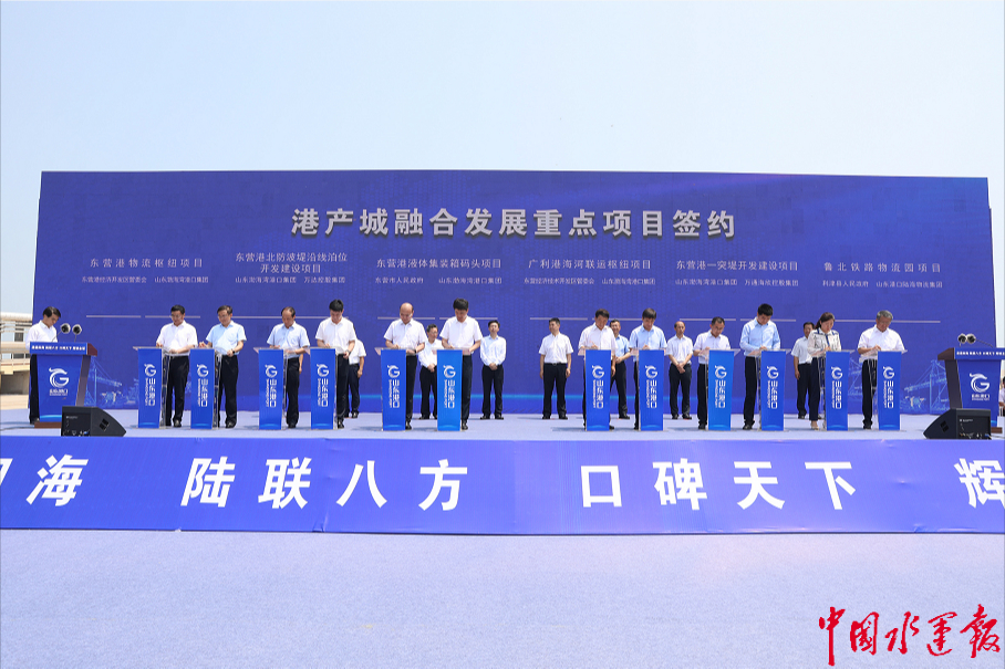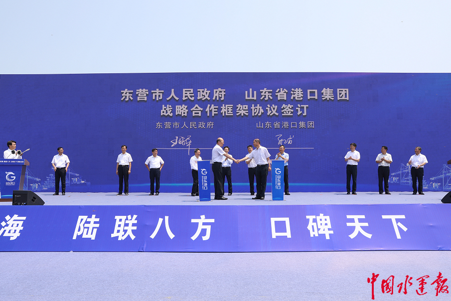 7月15日,山东省港口集团与东营市人民政府战略合作框架协议签订暨东营港液体集装箱码头项目启动、东营港北防波堤2×10万吨级液体化工品码头开工仪式在山东港口东营港举行,根据协议,双方将在发展战略、港口建设、港产城融合发展、生态绿色平安港口建设等方面建立长期战略合作伙伴关系,加强港口和城市资源优势互补,共同推进港口发展与地方经济发展融合,实现共赢。