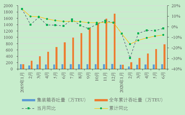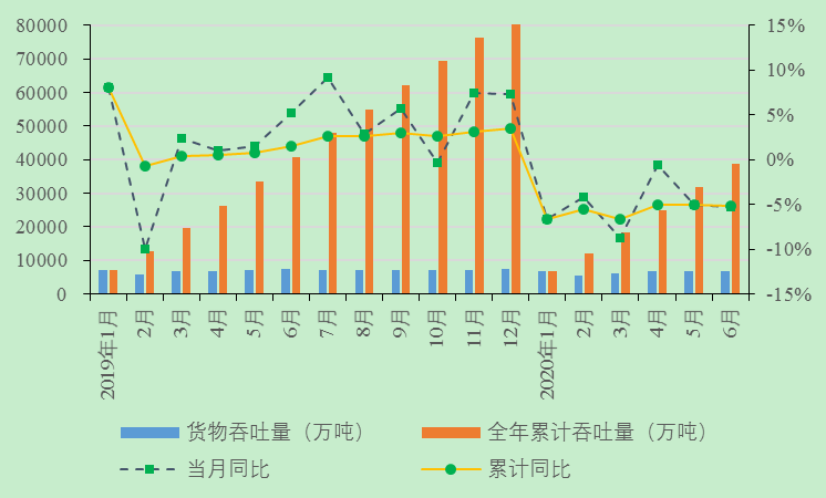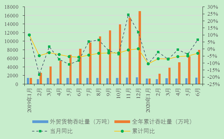 6月份,长江干线主要港口企业货物吞吐量、集装箱吞吐量同比下降、环比上升,外贸货物吞吐量同比、环比均上升。