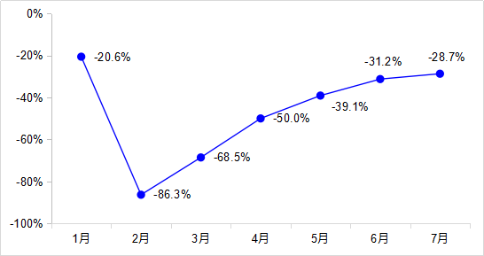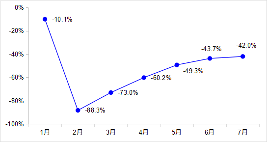 7月,完成营业性客运量8.9亿人,恢复至去年同期的58.0%,恢复程度较6月提高1.7个百分点,其中公路营业性客运量下降42.5%、水路客运量下降45.9%。