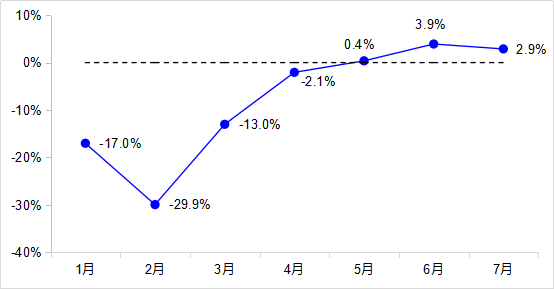 7月,完成货运量41.2亿吨,同比增长2.9%,连续3个月实现正增长,其中公路货运量增长3.1%、水路货运量下降0.3%。