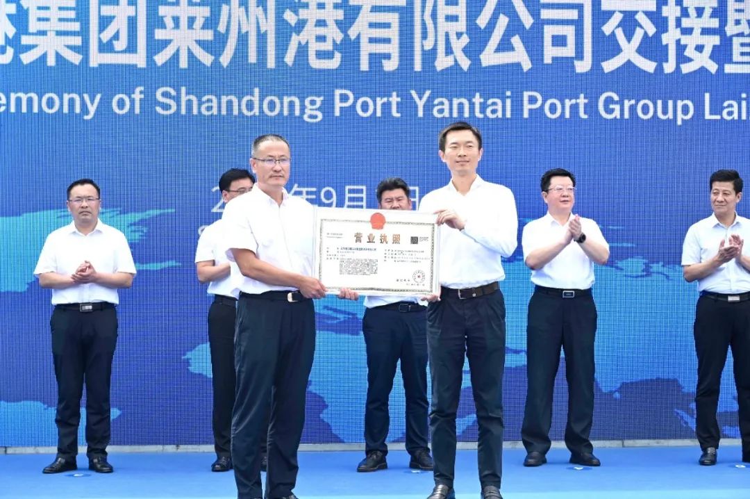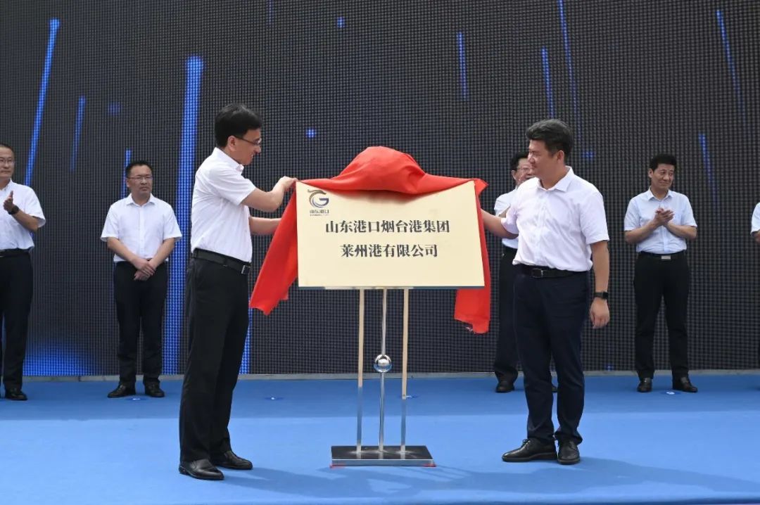 仪式上,中海港务(莱州)有限公司股东代表崔文罡与山东港口烟台港副总经理刘刚交接营业执照。山东省港口集团党委常委、副总经理孙付春与莱州市委书记于宁共同揭牌。