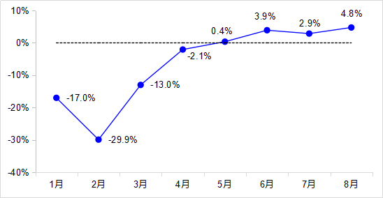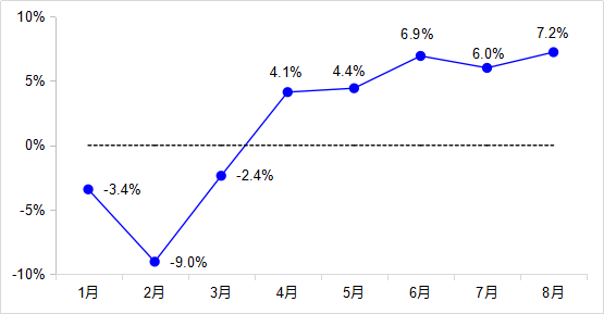 8月,完成货运量43.1亿吨,同比增长4.8%,增速较7月加快1.9个百分点,已恢复至去年同期水平,其中公路货运量增长5.5%、水路货运量增长0.6%。