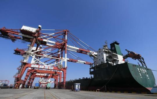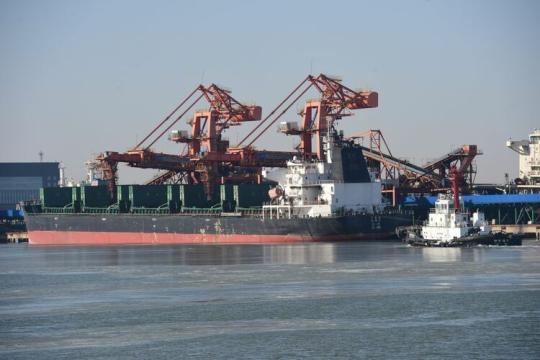 2月22日,从河北黄骅港驶来的宝安城89号货轮停靠在天津港联盟国际集装箱码头。新华社记者赵子硕 摄
