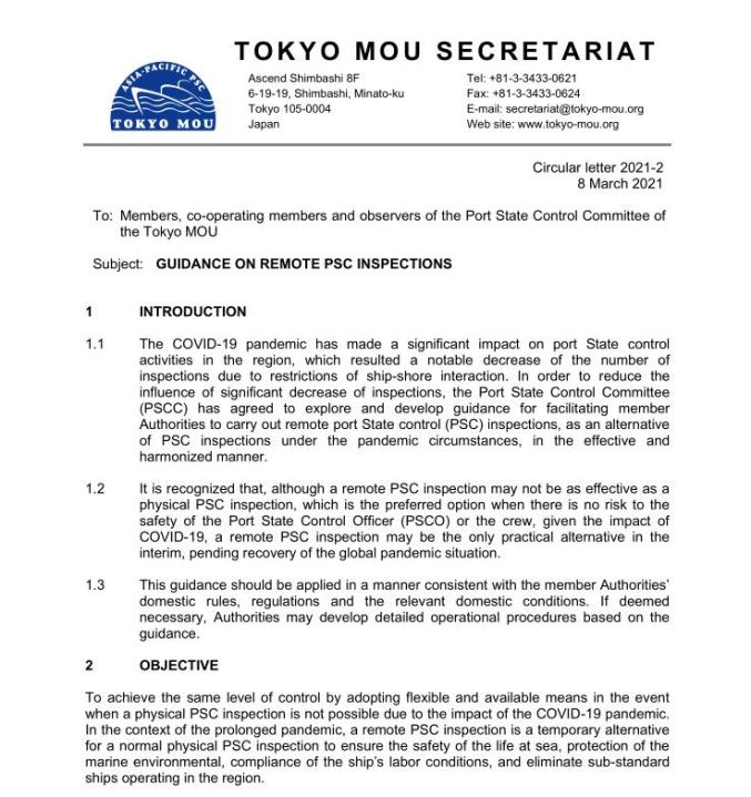 2021年3月8日,东京备忘录组织以通函形式宣告由中国牵头制定的《远程港口国监督检查指南》(以下简称《指南》)获得一致通过,要求各成员及时将《指南》分发至所有PSCO,并将于4月1日起正式在亚太地区21个成员国和地区实施远程港口国监督检查机制,成为新冠疫情期间常规登轮港口国监督检查的重要备选模式。