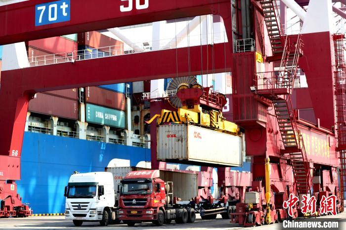 在山东港口青岛港前湾集装箱码头,货车往来穿梭装运货物。张进刚 摄