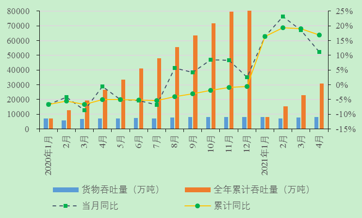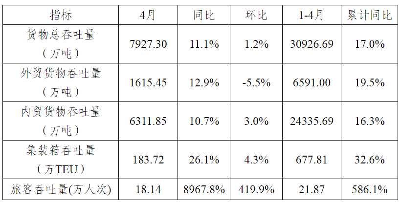 1-4月,主要港口企业完成货物吞吐量30926.69万吨,同比增长17.0%;其中,出港13930.05万吨,进港16996.64万吨,同比分别增长21.7%和13.4%。从主要货种看,金属矿石吞吐量同比增长6.4%,矿建材料吞吐量同比增长42.6%,煤炭及制品吞吐量同比增长9.9%,钢铁吞吐量同比增长20.8%,非金属矿石吞吐量同比增长10.1%,石油、天然气及制品吞吐量同比增长24.3%。
