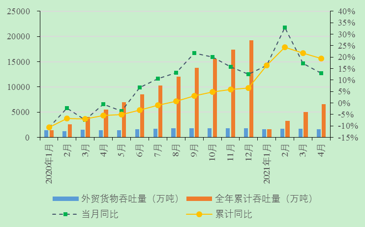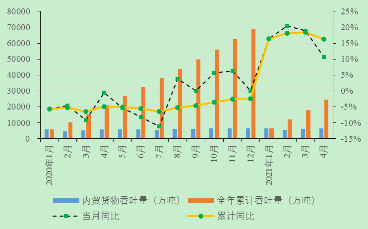 4月,主要港口企业货物吞吐量延续增长,其中外贸、内贸货物吞吐量同比均保持增长,增速略有放缓。