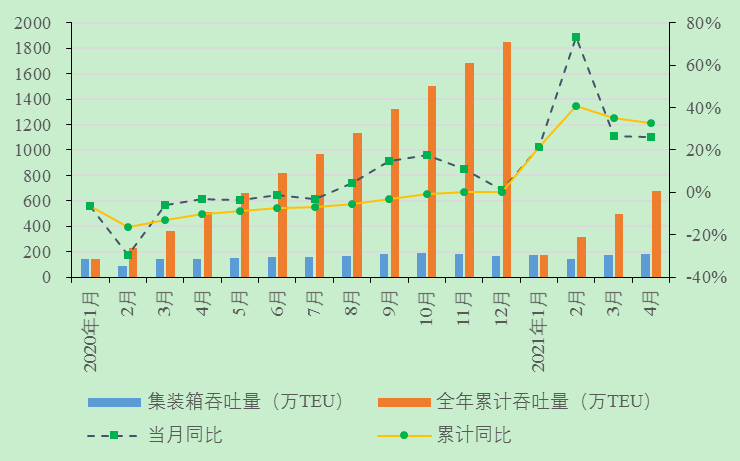4月,主要港口企业完成集装箱吞吐量183.72万TEU,同比增长26.1%,环比增长4.3%;其中,出港94.72万TEU,进港89.00万TEU,同比分别增长25.8%和26.5%,环比分别增长5.6%和2.9%。外贸集装箱吞吐量完成78.02万TEU,内贸集装箱吞吐量完成105.70万TEU,同比分别增长30.7%和22.9%,环比分别增长1.8%和6.1%。