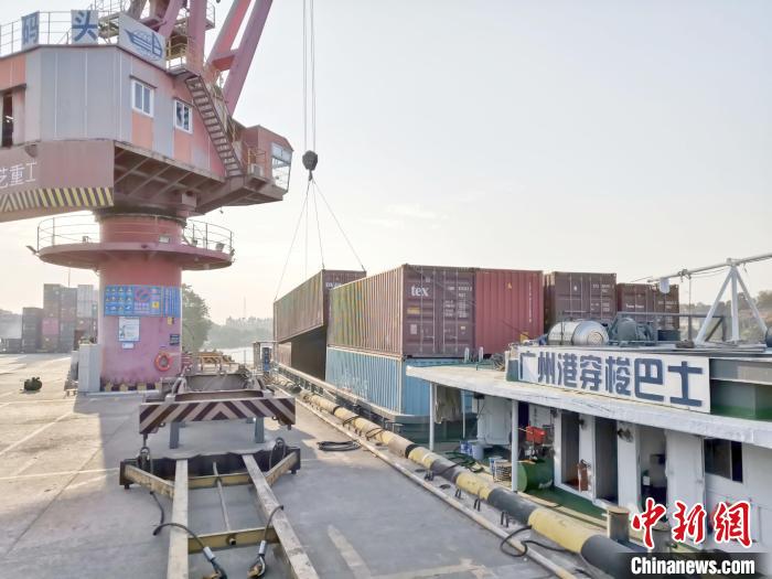 中新网广州6月14日电 (蔡敏婕 张敏敏)广州港集团14日称,近日,广州港穿梭巴士“穗港1801”轮满载装满白色家电冰箱的集装箱,抵靠广州港集团南沙港区。