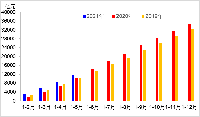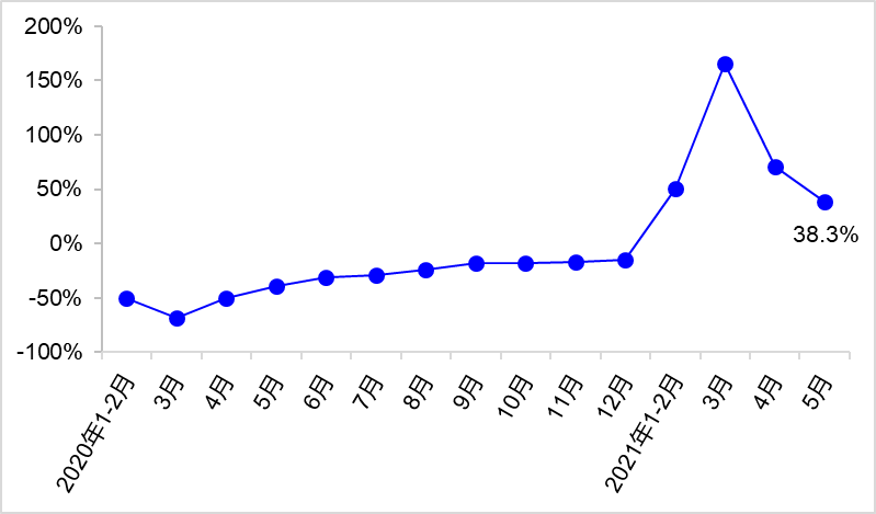 5月,完成营业性货运量45.8亿吨,比2020年同期增长12.6%,比2019年同期增长13.0%。其中,完成公路货运量34.8亿吨,比2020年同期增长14.4%;完成水路货运量7.0亿吨,比2020年同期增长5.9%。
